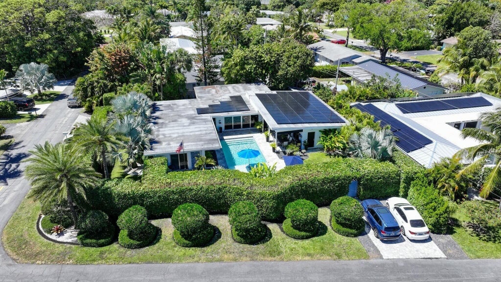 Stunning Mid-Century Modern Gem in Desirable Chapel Hill. This beautifully restored 3-bedroom, 2-bath home seamlessly blends modern updates with timeless mid-century charm. Spanning over 2,500 sq. ft., this rare find boasts original terrazzo flooring, vaulted wood beam ceilings, and a Palm Springs-style pool and patio--perfect for effortless indoor-outdoor living. Expansive hurricane-rated windows and sliders fill the home with natural light, offering seamless access to the lush, professionally landscaped corner lot--a private tropical oasis surrounded by mature plantings.Inside, the chic gourmet kitchen showcases state-of-the-art appliances and extends into a stylish breakfast area with custom cabinetry. The spacious living and family rooms feature soaring wood ceilings, addng to