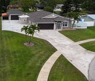 This one-of-a-kind waterfront home offers approx. 4,500 total sq ft on an oversized corner lot -- with extended driveway perfect for RVs, boats, or up to 15 cars! No HOA! Inside, enjoy spacious living and family rooms, a chef's kitchen with 10' island, custom cabinetry, and quartz countertops. The great room features a 6-person jacuzzi -- ideal for entertaining with views of the $150K custom backyard, pool, and canal. Safe & Security Cameras. It also features a 2-car front garage and an extra 230 sq ft utility garage for toys or equipment. But the show-stopper is the additional 800 sq ft Harley-Davidson-themed man cave garage with central A/C, built-in motorcycle lifts, stainless countertop, and custom tool cabinets, all valued at $225k.