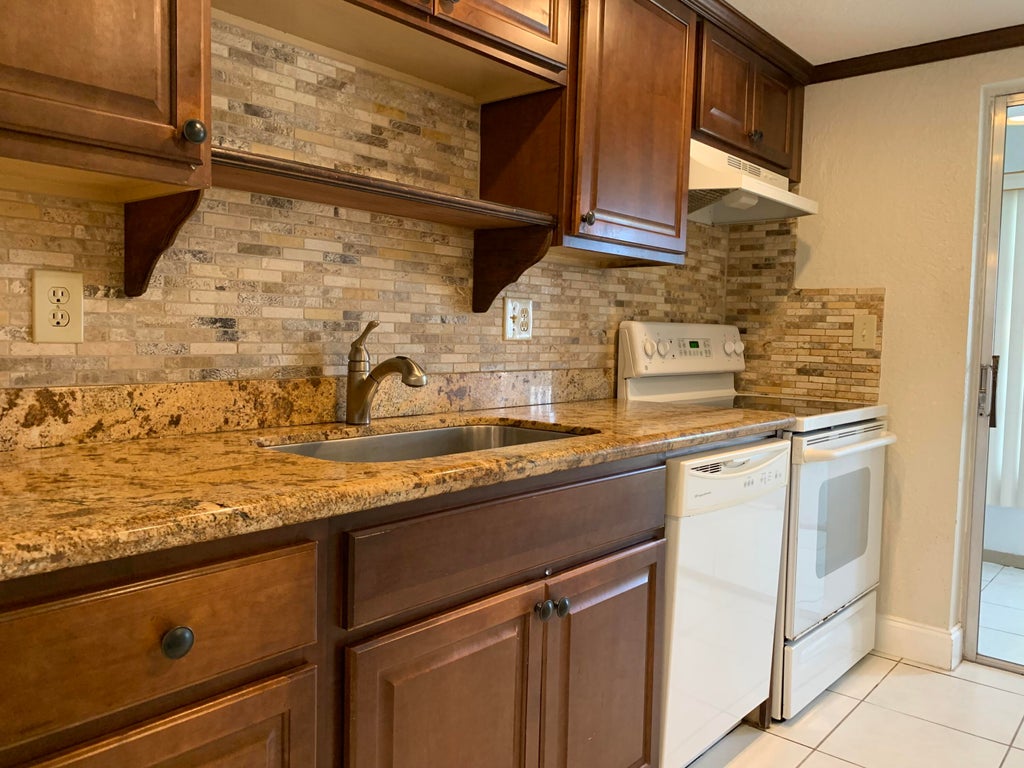 Spacious first-floor condo featuring 1 bedroom, 1.5 bathrooms, and a bright Florida room with serene views of the green space and clubhouse. Enjoy the convenience of an on-site laundry room on each floor and an assigned parking space. Ceramic tile throughout the living areas. Kitchen with newer cabinets and granite counters. Both bathrooms have been remodeled. This vibrant 55+ community offers resort-style amenities, including two pools, a sauna, a clubhouse with card rooms, a theater, a billiards room, and a fitness center. Ideally located just minutes from shopping, dining, entertainment, and the beach.