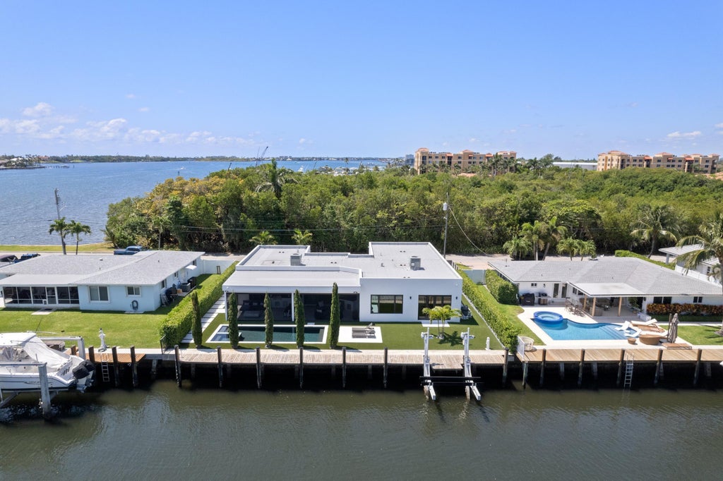 This gorgeous, contemporary, move-in ready, newer construction home is a boater's dream, with over 90 feet of waterfrontage, a rebuilt seawall, and a new 20,000 lb boat lift--just 1.3 miles from the Boynton Inlet and the Atlantic Ocean. High-end features include large-format porcelain flooring throughout, top-of-the-line impact windows and doors, a full-home generator, a reverse osmosis water filtration system, a state-of-the-art security system, and more. The gourmet chef's kitchen is equipped with custom wood cabinetry, marble countertops, and top-of-the-line Monogram appliances. The spacious primary suite offers two oversized walk-in closets and a luxurious five-piece bathroom.The outdoor space is equally impressive, with a large, covered loggia with electric shades, new turf, a heated saltwater pool, new landscape lighting, and a fully equipped outdoor kitchen. The two-car garage has been recently upgraded with epoxy flooring and custom built-in storage. 160 Periwinkle represents an exceptional value for a truly move-in ready, waterfront home!