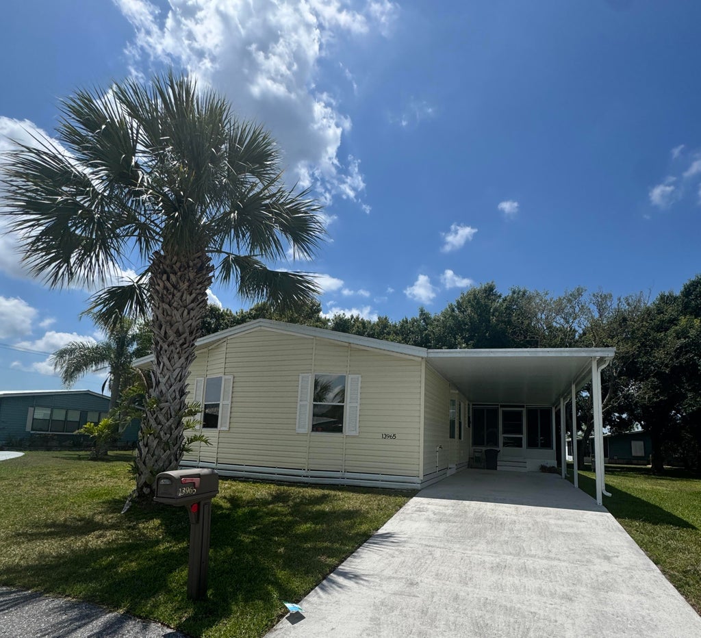 Lovely 2 bedroom 2 bath home. Home is located by club house and golf course. Peaceful backyard. Home has split floor plan with open kitchen. laundry is inside of home. Screened in lania for enjoying morning coffee or evening cocktails. Home sits on a very quite cal da sac. Brand new A/C 2025. Lawn care and trash removal included in lot rent. 2 pools, tennis, pickleball, bocceball, shuffle board, golf 18 hole golf course. club house and much more. MUST SEE!