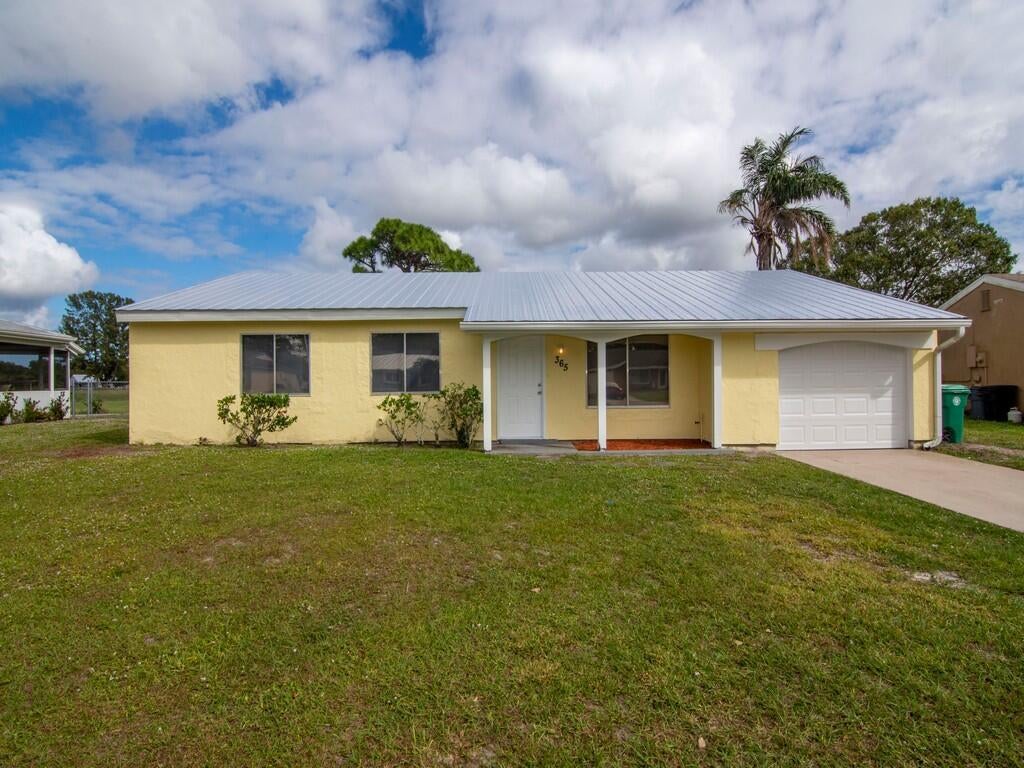 Welcome to this charming 2-bedroom, 2-bath home nestled SW Pt. St Lucie with lake view in the rear. This well-maintained frame-constructed home features a new 2022 metal roof, 2019 HVAC, 2022 water heater, and 2022 garage door, offering peace of mind for years to come. Inside, you'll find a freshly updated kitchen and bathrooms with newer cabinets, and uniform tile flooring throughout for easy maintenance and a clean, modern look. Enjoy the tranquil setting from your backyard overlooking the lake--perfect for morning coffee or evening relaxation. This home combines comfort, functionality, and great updates, making it a perfect primary residence or investment opportunity. Conveniently located near schools, shopping, and major roadways.